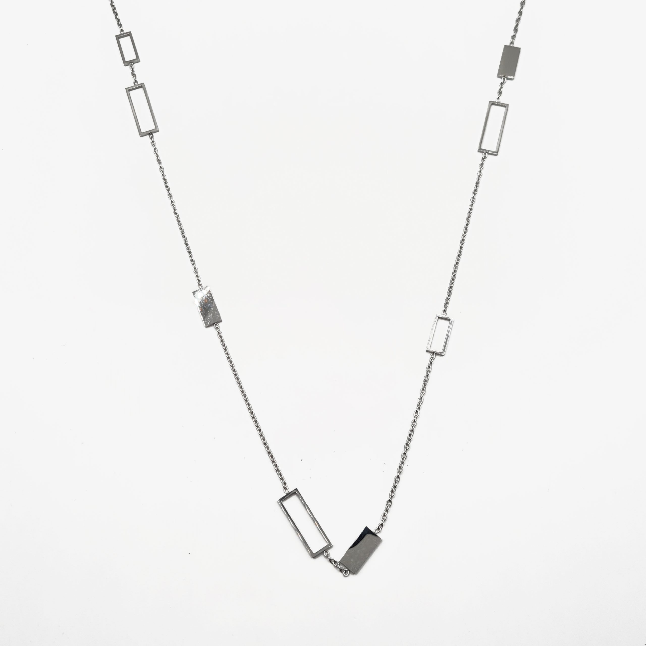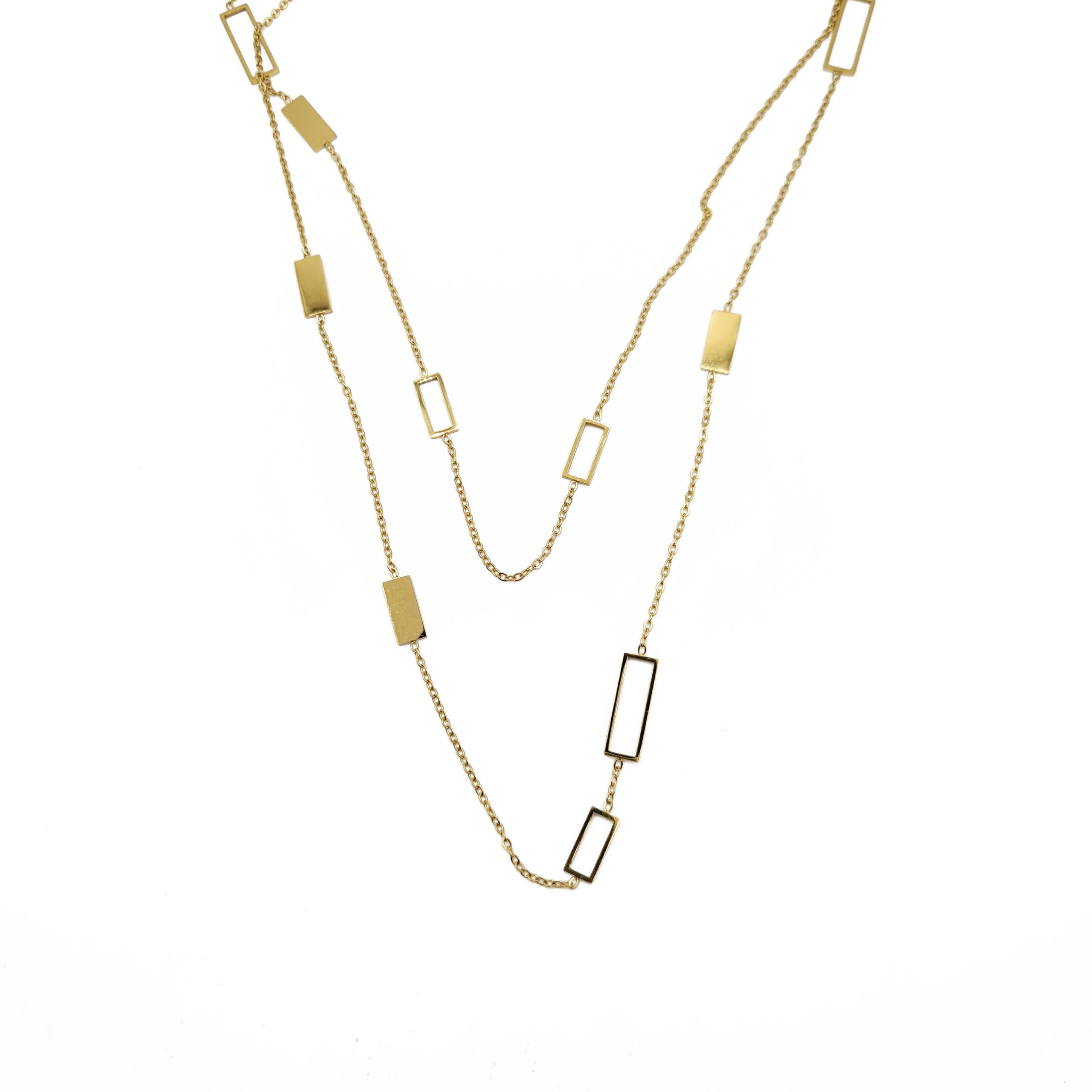 Este collar largo de diseño moderno combina elegancia estructural con un acabado pulido y duradero. Elaborado íntegramente en acero inoxidable, destaca por la secuencia de placas geométricas intercaladas con eslabones rectangulares, creando una silueta fluida y sofisticada.