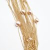 Este collar largo con perlas, de estilo delicado combina varias cadenas finas doradas entrelazadas con perlas en tono rosa suave y cuentas facetadas transparentes, creando un diseño luminoso y sofisticado.