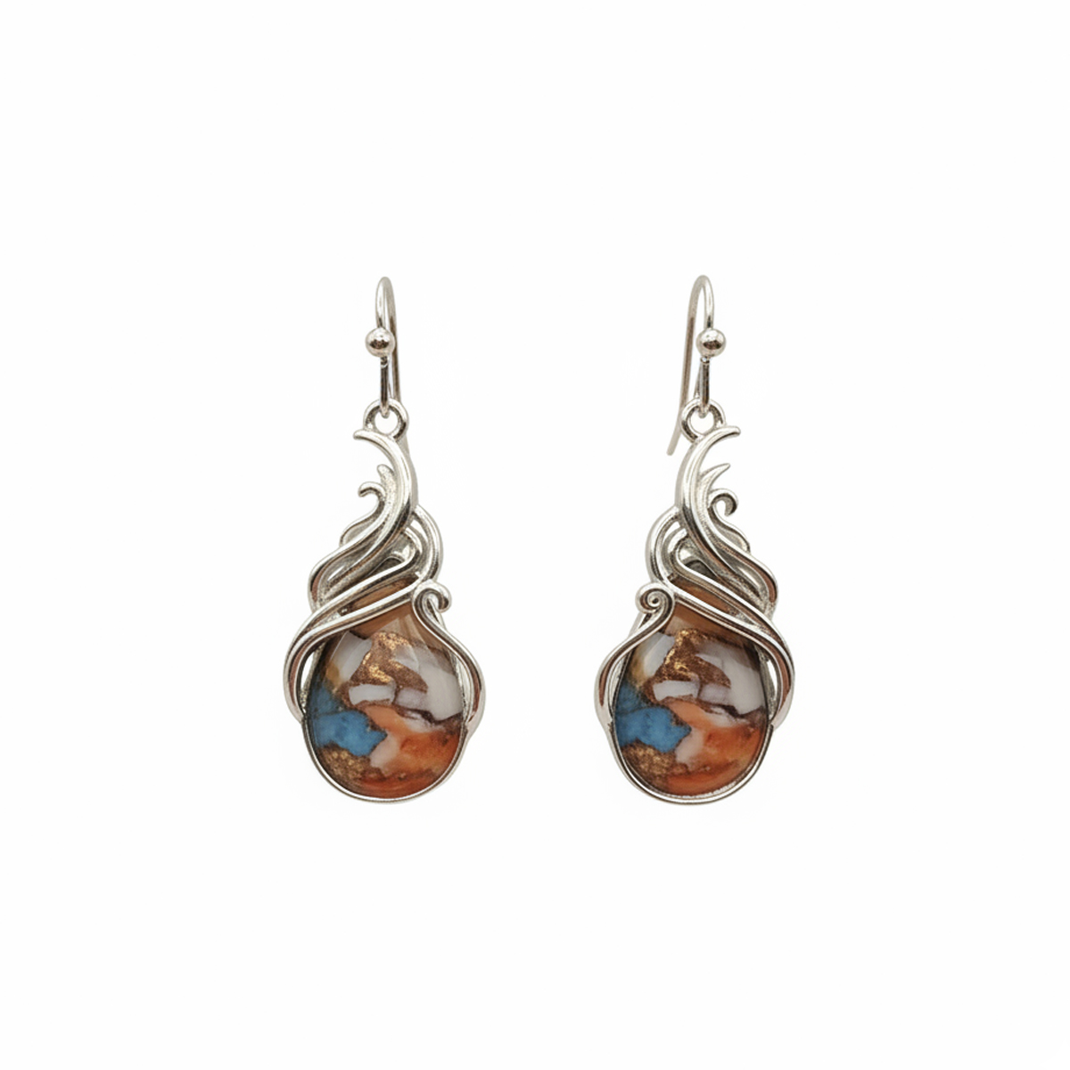 Aros tipo lágrima con marco metálico plateado, elaborada en acrílico moldeado con diseño marmolado en tonos naranjo, azul y blanco. El acabado brillante y el patrón fluido aportan energía visual y estilo artesanal.